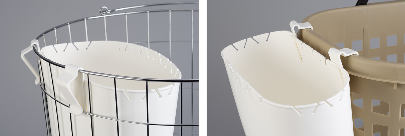 細いワイヤ―にも、しっかりフチのあるバスケットにもOK!