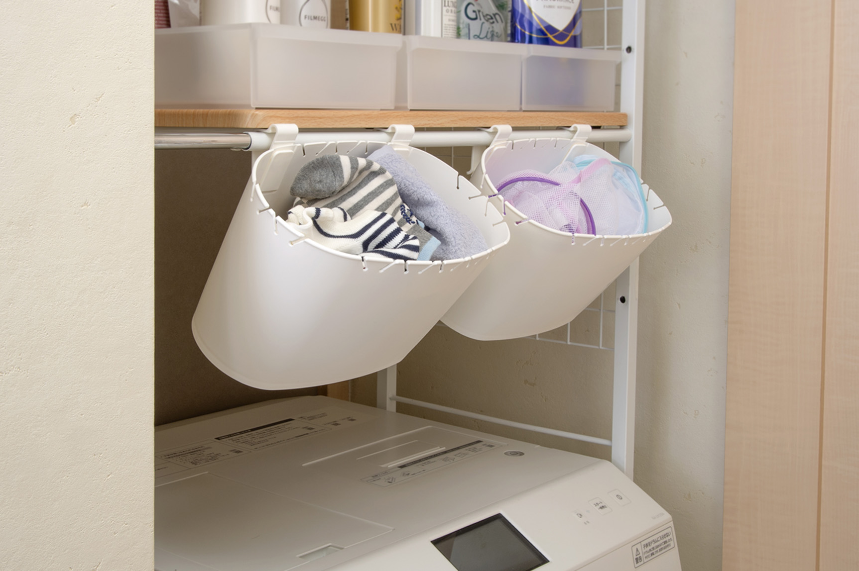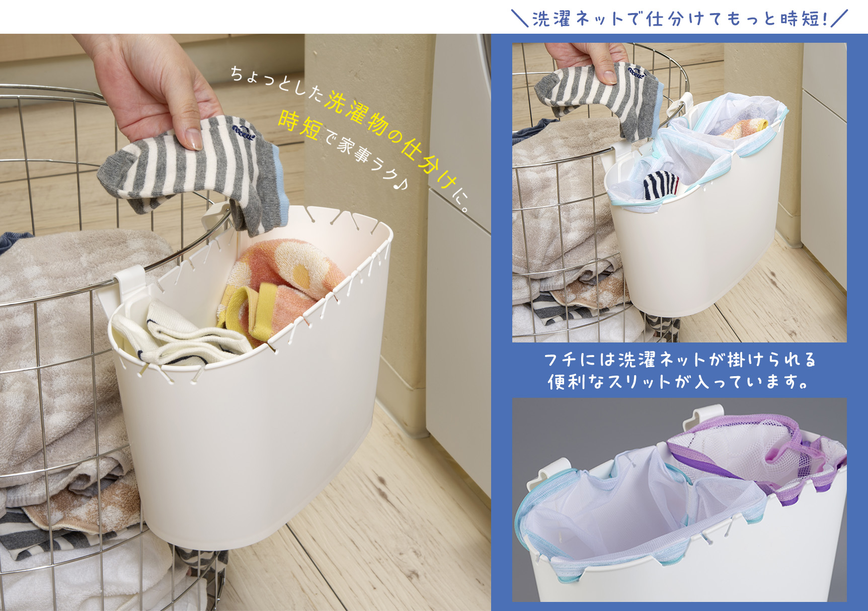 ランドリーラックやワイヤーネットに掛けて、洗濯ネット収納としても活躍します。