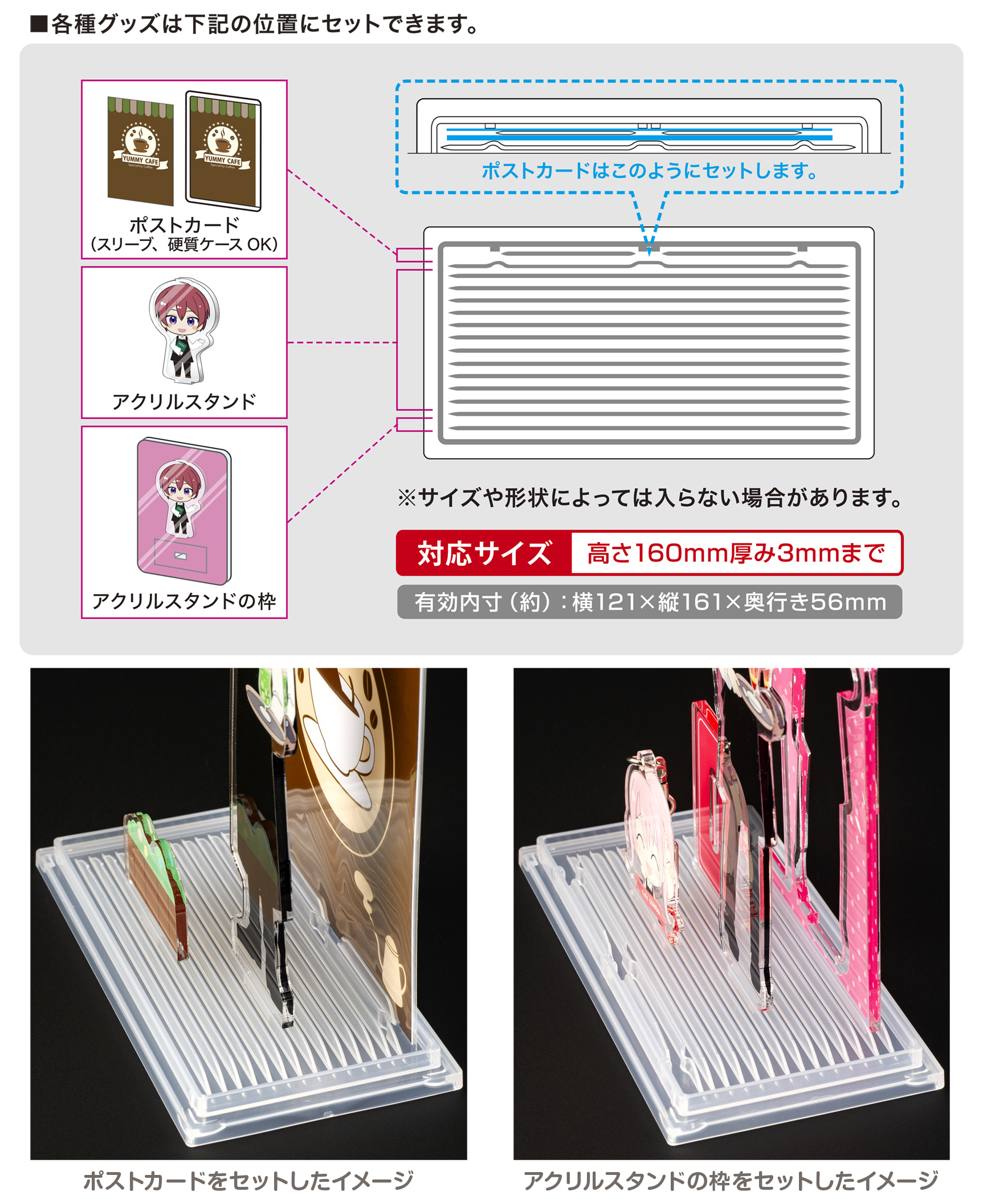 台座の溝に各種グッズを差込み、「推し空間」を自由に演出♪