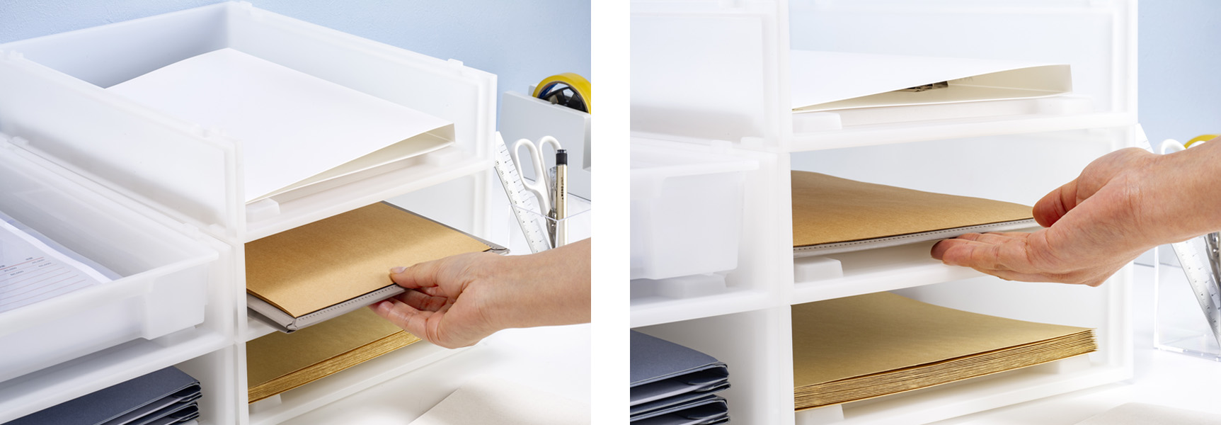 ファイルラックの底面は凹形状になっており、書類の出し入れがしやすくなっています。